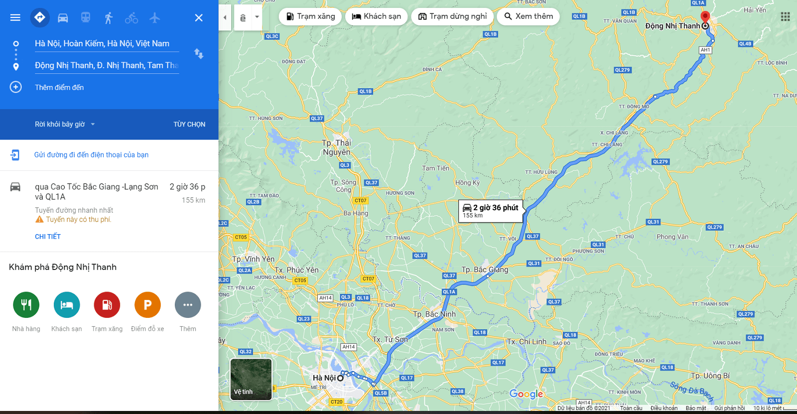 Bản đồ đi từ Hà Nội đến Động Nhị Thanh