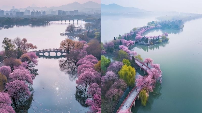 Sắc hoa đào rực rỡ khi xuân về tại Thọ Tây Hồ Dương Châu (Ảnh: XHS@小源风景的诗篇)