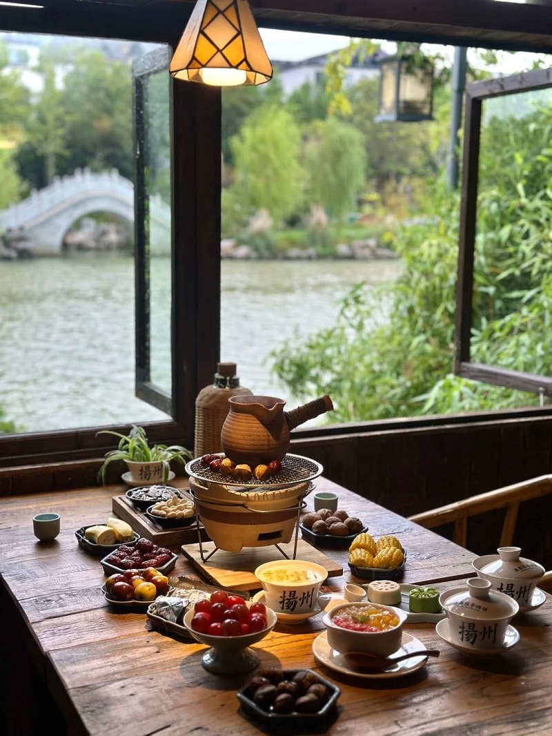Trà chiều ở Dương Châu không chỉ là uống trà mà là một hình thức thưởng thức ẩm thực chậm. Trà nóng được dùng kèm bánh hấp, dimsum Giang Nam, bánh mặn – ngọt nhẹ, ăn từng chút một.