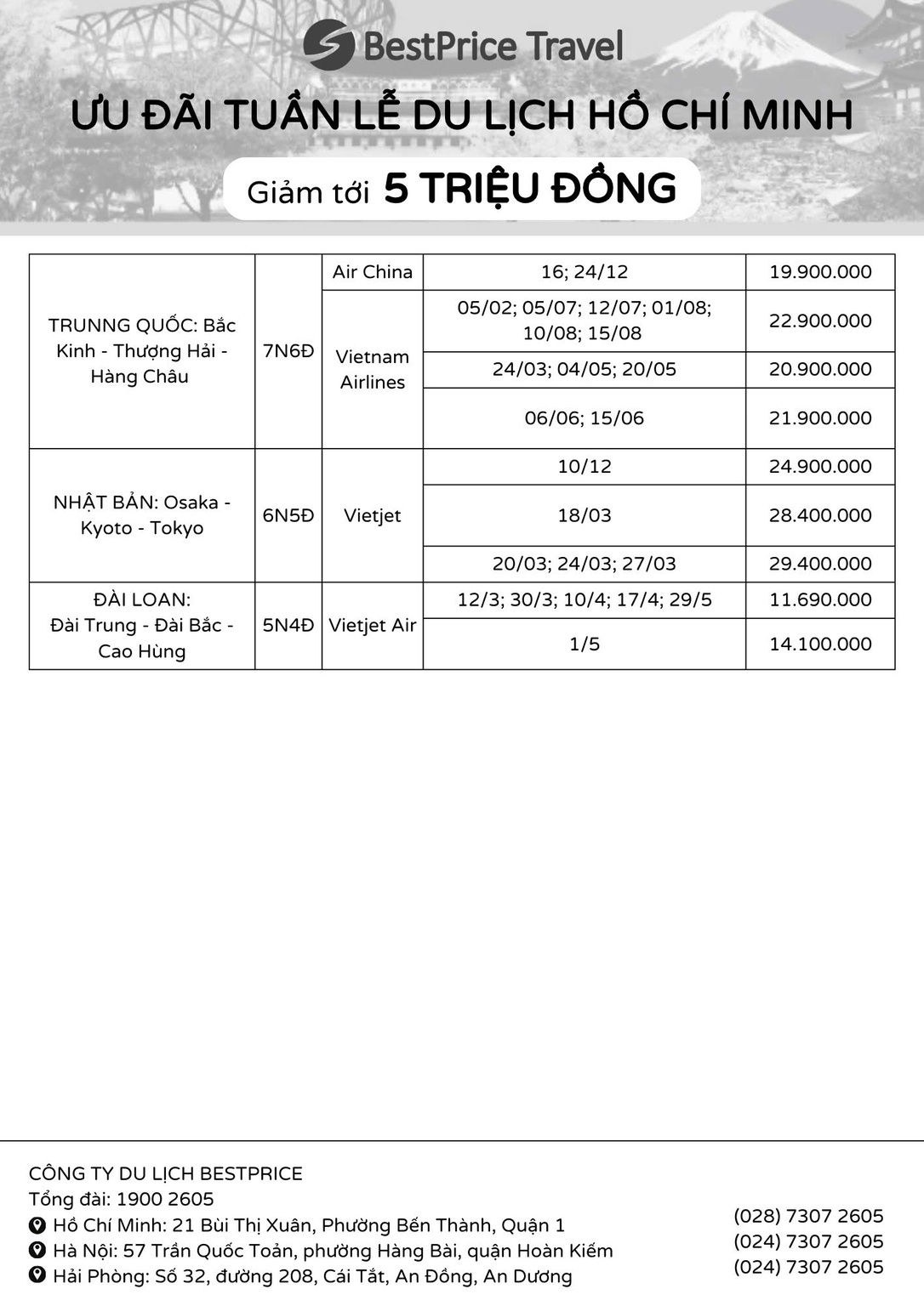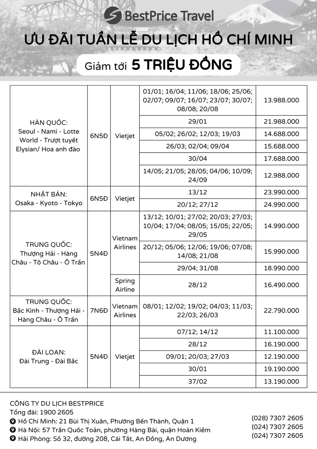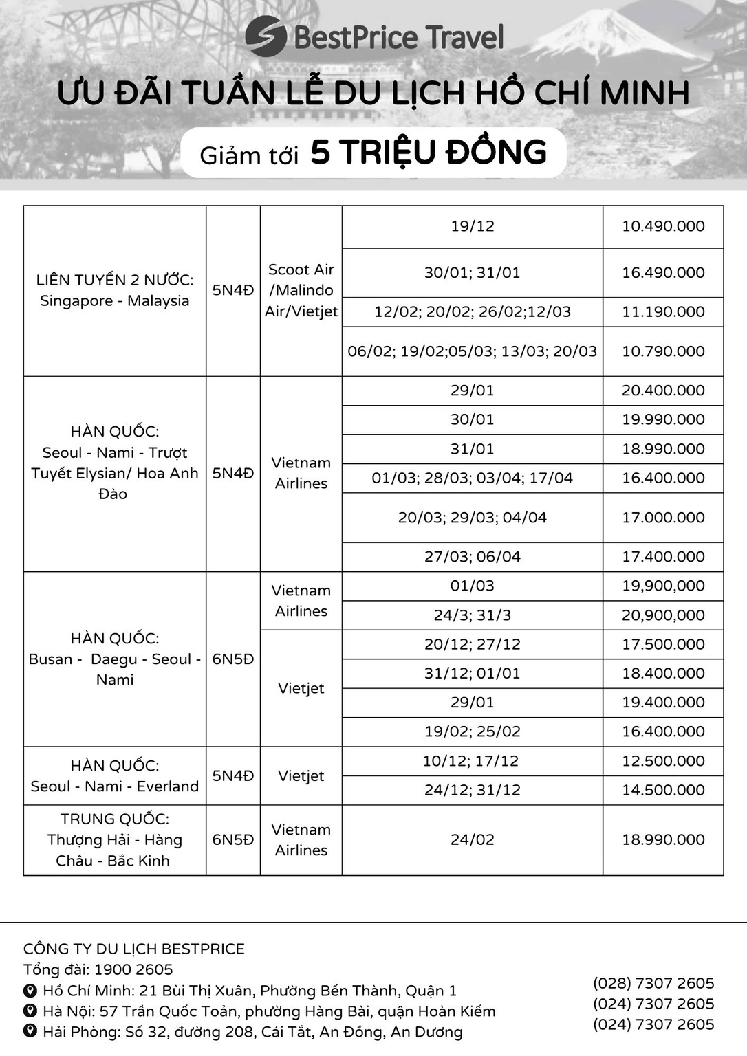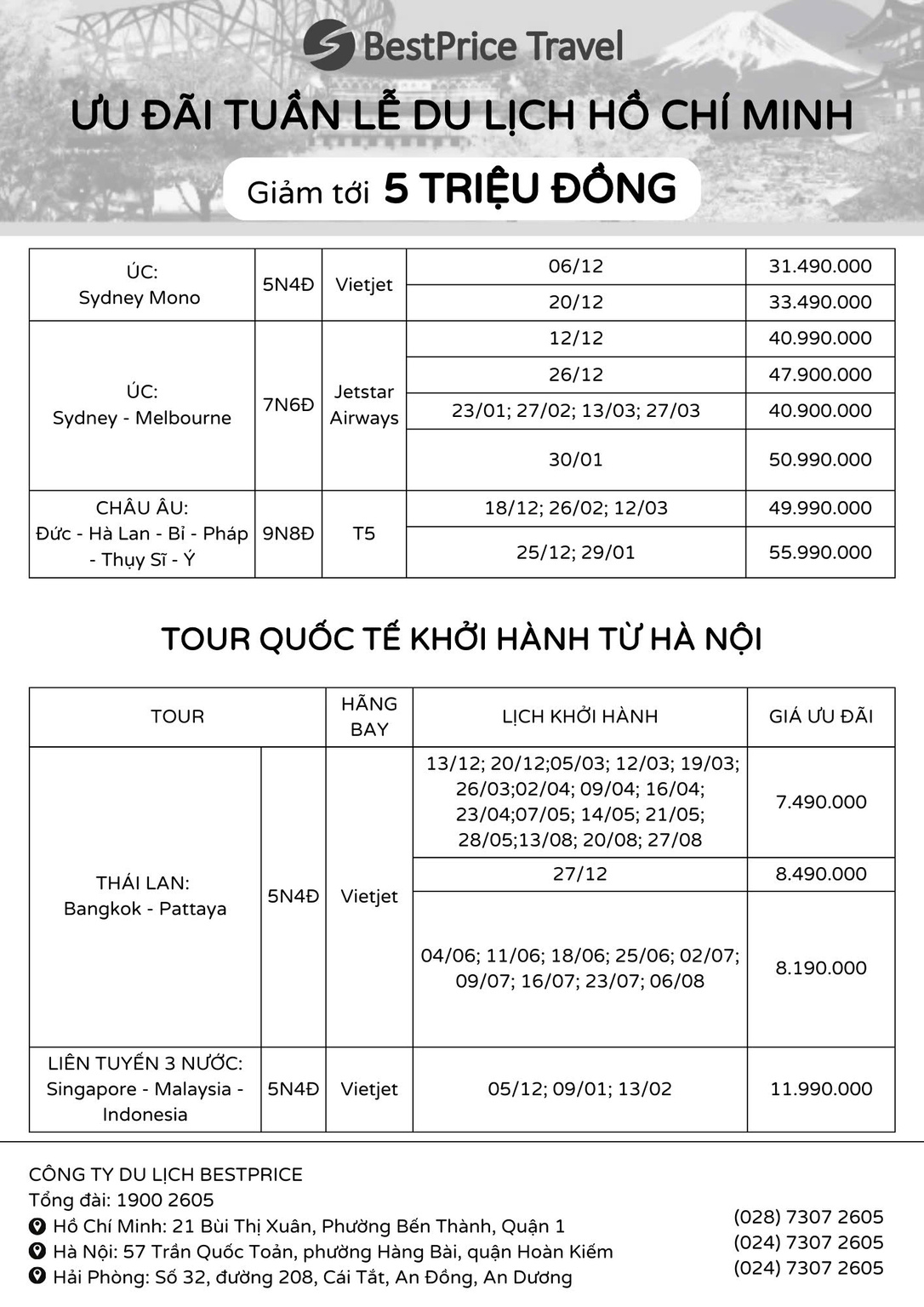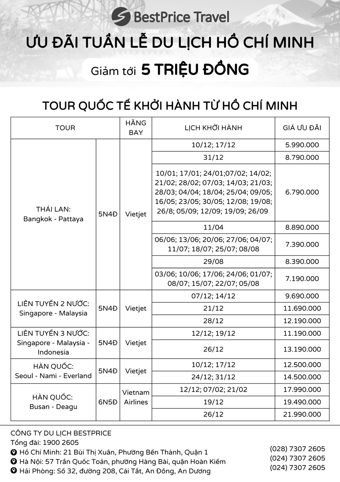 Nhân dịp sự kiện, BestPrice mang đến chương trình ưu đãi cực khủng, giúp du khách tận hưởng những chuyến đi trọn vẹn và ý nghĩa bên gia đình. Đặc biệt, các tour Tết 2025 với những điểm đến "hot" như Thái Lan, Singapore, Malaysia, Trung Quốc, Hàn Quốc, Nhật Bản, quý khách sẽ nhận ngay ưu đãi lên tới 5.000.000 VND/khách.