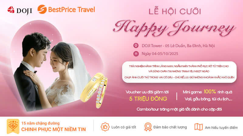 Tháng 10 này, không khí mùa cưới tại Hà Nội thêm phần sôi động khi BestPrice Travel chính thức đồng hành cùng DOJI trong sự kiện cưới lớn nhất năm – Happy Journey. Lễ hội sẽ diễn ra từ ngày 04 – 05/10/2025 tại DOJI Tower, 05 Lê Duẩn, Ba Đình, Hà Nội, hứa hẹn trở thành điểm hẹn ngọt ngào cho những cặp đôi đang chuẩn bị cho ngày trọng đại và khởi động kế hoạch trăng mật trong mơ.