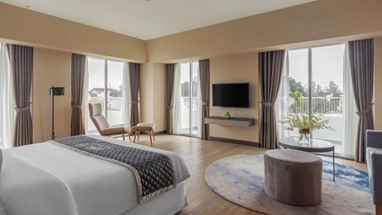 - Golf Valley Suite: Golf Valley Suite là hạng phòng cao cấp nhất của khách sạn, nổi bật với không gian rộng rãi và đồ nội thất sang trọng. Hạng phòng này được trang bị giường đôi cỡ lớn phù hợp cho 2 người lớn cùng 2 trẻ em. Quý khách có thể yêu cầu kê thêm giường phụ và lựa chọn phòng có view phố hoặc đồi.