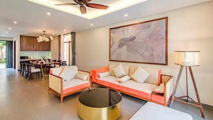 - Villa 2 phòng ngủ: Là một trong những hạng phòng cao cấp tại khách sạn với diện tích phòng lên đến 120m2. Villa có không gian rộng rãi, thiết kế sang trọng và hướng thiên nhiên trong lành. Phòng gồm có 2 phòng ngủ có thiết kế đơn giản đậm chất phong cách Hội An và view nhìn ra sông Hoài. Biệt thự gồm 1 phòng giường đơn, bồn tắm hiện đại và 1 phòng có 2 giường đơn. Hạng phòng này có khu ăn uống và không gian sinh hoạt cùng khu vườn chung. Sức chứa 4 người lớn và 2 trẻ em.