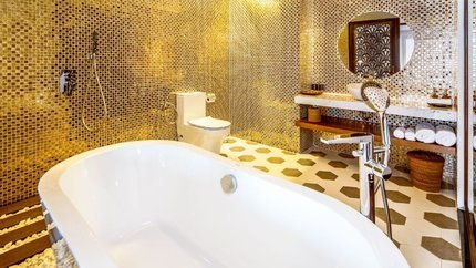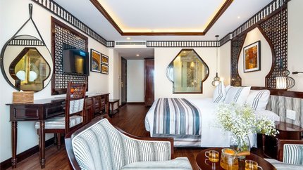 - Mô tả: Đây là hạng phòng hướng phố có ban công. Phòng có diện tích rộng nhất của khu nghỉ dưỡng có thiết kế tối giản và độc đáo. Điểm nhấn của hạng phòng này là phòng tắm được dát vàng vô cùng xa hoa và lộng lẫy. Trong phòng được tích hợp đầy đủ tiện nghi sang trọng. Sức chứa 2 người lớn và 1 trẻ em.