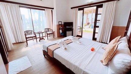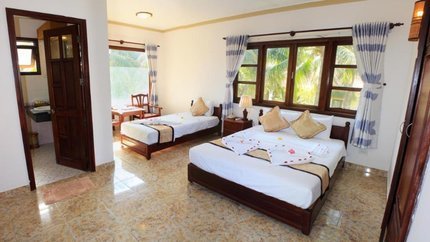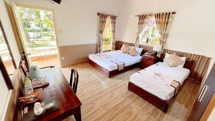 - Mô tả: Đây là hạng phòng có diện tích rộng nhất của resort với 40m2, hướng sân vườn và hồ bơi. Phòng Deluxe Family gồm tất cả 12 phòng có thiết kế sang trọng và cách hồ bơi chỉ 5m, bãi biển 10m. Khu vực xung quanh phòng Deluxe Family có không gian thiên nhiên gần gũi với vườn hoa lý tưởng để du khách hòa mình cùng thiên nhiên khi nghỉ dưỡng. Khu vực ban công có view vườn và thảm cỏ xanh tươi, cùng với ghế cho du khách ngắm cảnh. Hạng phòng này có thiết kế phù hợp cho gia đình hoặc nhóm bạn.
