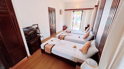 - Mô tả: Hạng phòng Deluxe Triple gồm tất cả 14 phòng nghỉ có hướng hồ bơi và sân vườn. Điểm nhấn của hạng phòng này là có lối đi bộ ra bãi biển chỉ vài bước chân, cực kỳ tiện để du khách đi dạo và tắm biển. Mỗi phòng nghỉ hạng Deluxe Triple đều có ban công rộng rãi và trang bị bàn ghế ngoài trời cho du khách ngắm cảnh hoặc ăn tối lãng mạn. Hạng phòng này có sức chứa 3 người lớn, du khách có thể chọn phòng giường 3 giường đơn nhỏ hoặc 1 giường đôi lớn và 1 giường đơn nhỏ.