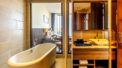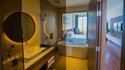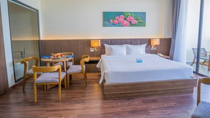 - Mô tả: Hạng phòng này là sự kết hợp giữa sự sang trọng và tinh tế. Phòng có diện tích rộng rãi trong đó phòng khách và phòng ngủ được thiết kế riêng biệt mang tới không gian riêng tư cho du khách. Hạng phòng này có ban công rộng với view ngắm cảnh biển. Ngoài ra, du khách có thể yêu cầu kê thêm giường phụ nếu có nhu cầu.