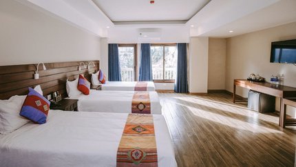 - Mô tả: Đây là hạng phòng có diện tích rộng nhất của khách sạn phù hợp với gia đình hoặc nhóm bạn. Điểm nhấn của hạng phòng này là view toàn cảnh núi Fansipan hoặc thung lũng Mường Hoa đẹp lãng mạn. Phòng có sức chứa 4 người lớn và 2 trẻ em. Điểm nhấn của hạng phòng này đó là được trang bị cửa sổ bằng kính rộng lớn cho du khách ngắm cảnh đẹp bên ngoài từ trong phòng.