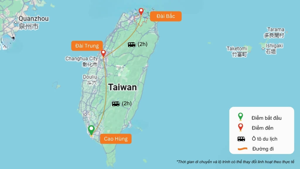 - Tour bay thẳng từ TP HCM, tham quan trọn ba thành phố nổi bật – Đài Bắc, Đài Trung và Cao Hùng – giúp tiết kiệm nhiều thời gian.